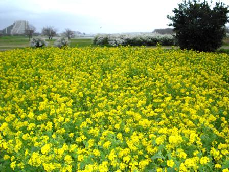 左手の写真は、桜並木の桜を見に行く途中に河川敷に咲いていた菜の花です。
