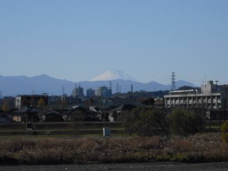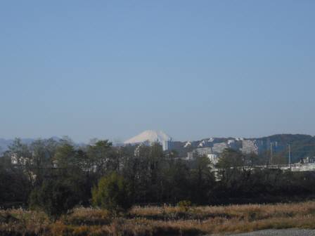 多摩川の岸辺に上がった瞬間、富士山が目に飛び込んできました(ヤッター)