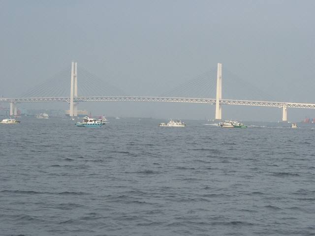 写真左は、首都高速湾岸線の横浜ベイブリッジです。東京のお台場のレインボーブリッジよりもひと