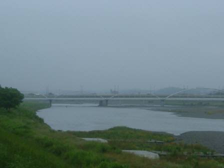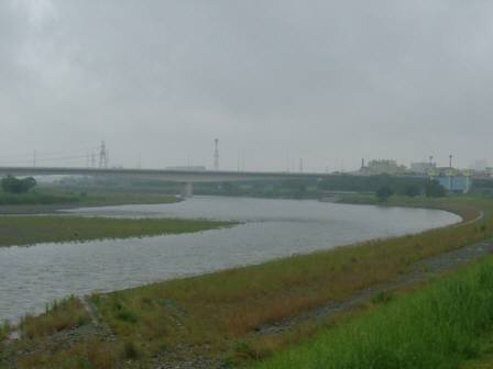 6月29日(日) 13:00現在の多摩川 気温22.5℃ 湿度76% やや強い雨 3mの南風