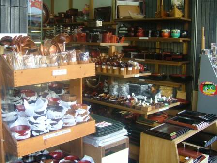 写真左は、このお店ならでは、しゃもじや食器具等、すべて木で作られたお店で有名です。