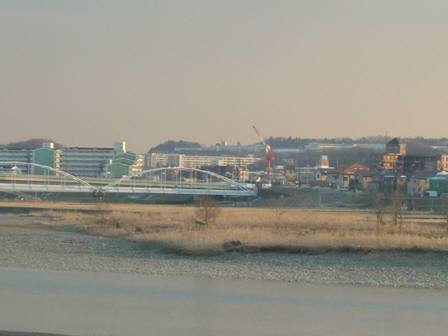 今日の多摩川、対岸の岸辺(写真左)に残雪が残っている程度です。