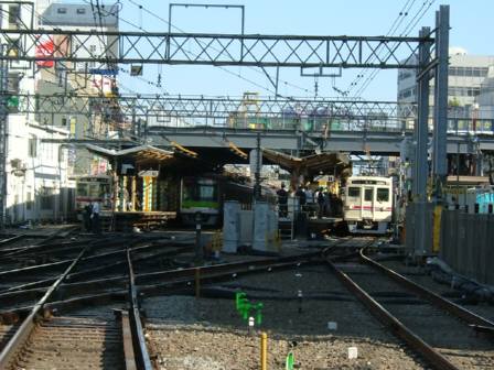 写真右は、西側から調布駅を撮りました(左から2線目に都営新宿線乗り入れの都営10-300型も見えています(薄暗く見えにくいですが・・(>_<))。駅の上に橋が架かっているのが見えます。現在、地下からホームに出ていた調布駅も数ヶ月後に橋上駅になります。この橋上駅の駅舎が完成したら本格的に掘削作業が始まるでしょう!
