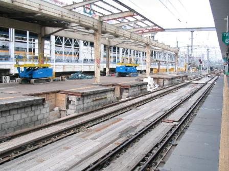 前回は、9番線、8番線の工事風景でしたが、今回は、8番線と同じホームの反対側の7番線・竹下駅寄りの工事風景です(6番線ホームから撮影)。写真の左手は、山陽新幹線のホームで、11番線に新大阪・博多間の営業運転を行っている8両編成の「レールスター(車体に黄色の帯がある)」が停車しています。