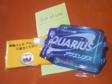 2枚目の写真は、私が募金と献血する前に貰ったアクアエリアス等です。