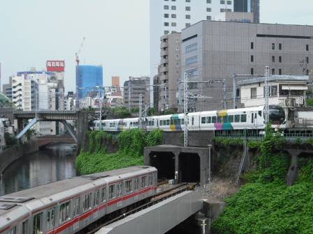 神田川を跨ぐように営団地下鉄丸の内線01系、中央快速線E257系がクロスする写真が撮れました。